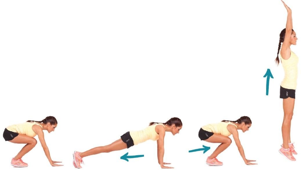 Cómo hacerlo: el movimiento comienza con una sentadilla, seguido de un movimiento rápido para colocar las manos en el piso y «patear» los pies hacia atrás, deteniéndose en la posición de flexión. Después de flexionar, jala las piernas hacia atrás hasta la posición en cuclillas y levanta el torso.