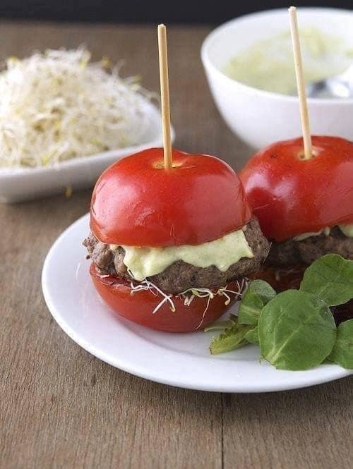 En lugar de colocar la hamburguesa entre dos rodajas de pan, hazlo entre dos mitades de tomate. Agrégale mayonesa o yogur griego y brotes de soja o alfalfa.