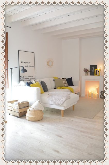 Para contrastar con el blanco, se busca colocar muebles de madera oscura a contra tono, entre tanto blanco y madera, se usa poner algún adorno o cuadro con colores mas llamativos para dar un toque, pero sin abusar.