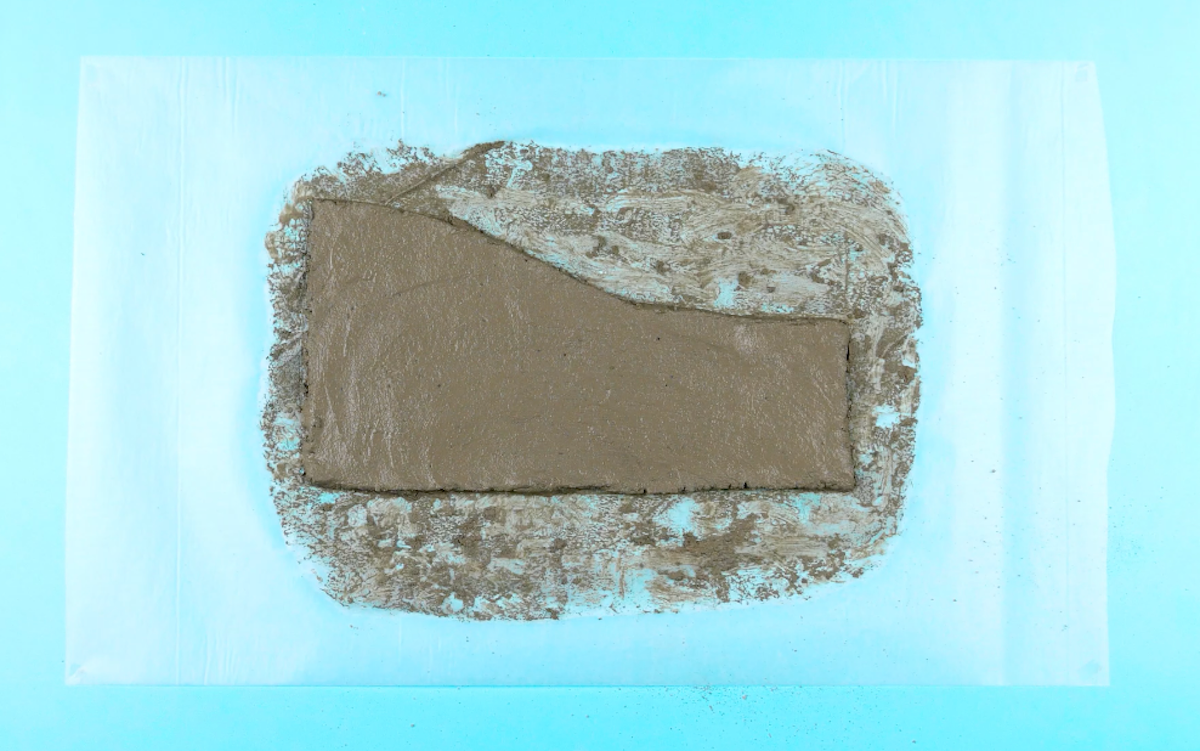 5.1. Extienda el cemento en forma de rectángulo sobre un trozo de papel pergamino. Corta la forma que se muestra en la foto de abajo con un cuchillo y retira el cemento restante.