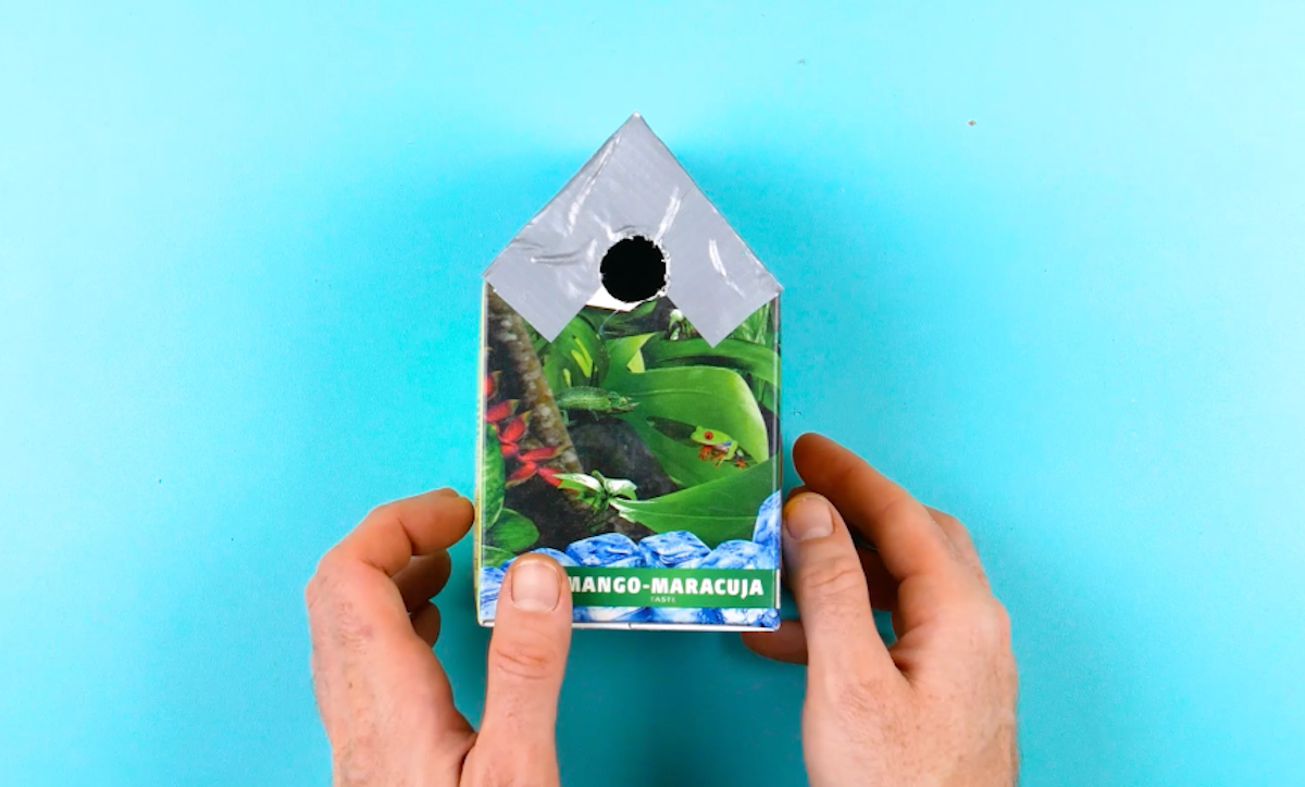 2.1. Haz una pequeña casa techada usando la caja y la cinta adhesiva. Corta un agujero en cada lado del techo para que parezca una casa para pájaros.