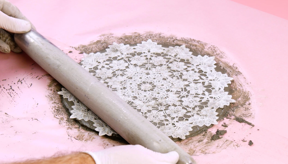 4.1. Extienda el cemento sobre un área grande y use el anillo como un cortador de cemento. Coloca el papel de encaje encima del cemento y pasa el rodillo por encima.