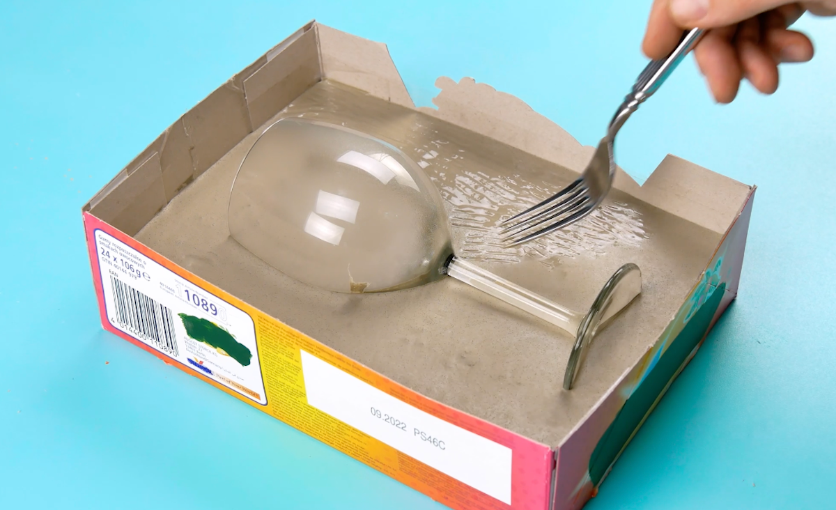 1.2. Agregue más cemento a la caja hasta que se cubra aproximadamente un tercio del recipiente. Dibuje un patrón en el cemento aún fresco con un tenedor y deje que se endurezca.