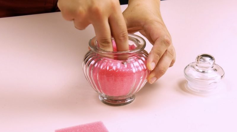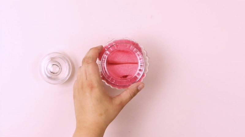 Llene la botella con el contenido de una pequeña botella de quitaesmalte. Solo tienes que meter los dedos en el bote de cristal y frotarlos sobre las esponjas para quitar el esmalte de uñas.