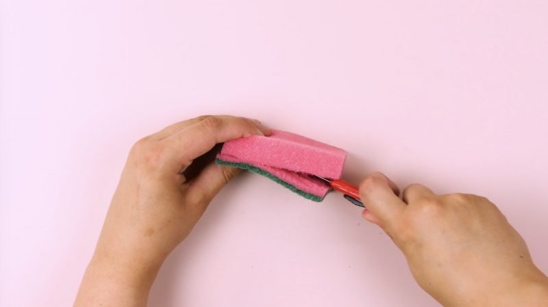 Con un cuchillo multiusos, corte la parte rugosa de 3 esponjas.
