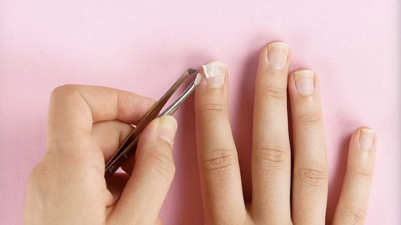 Con ayuda de unas pinzas, coloca la pieza sobre la uña rota.
