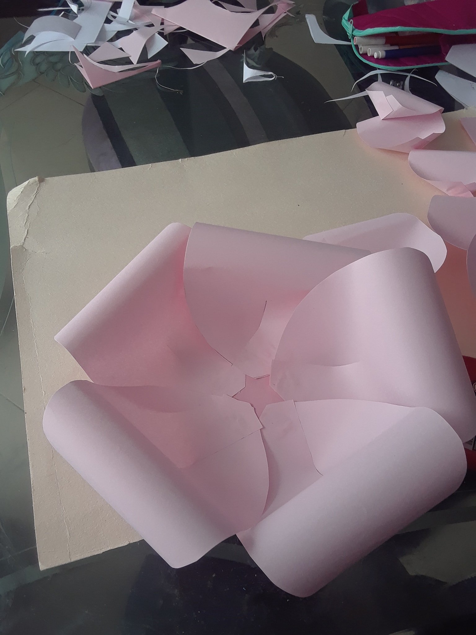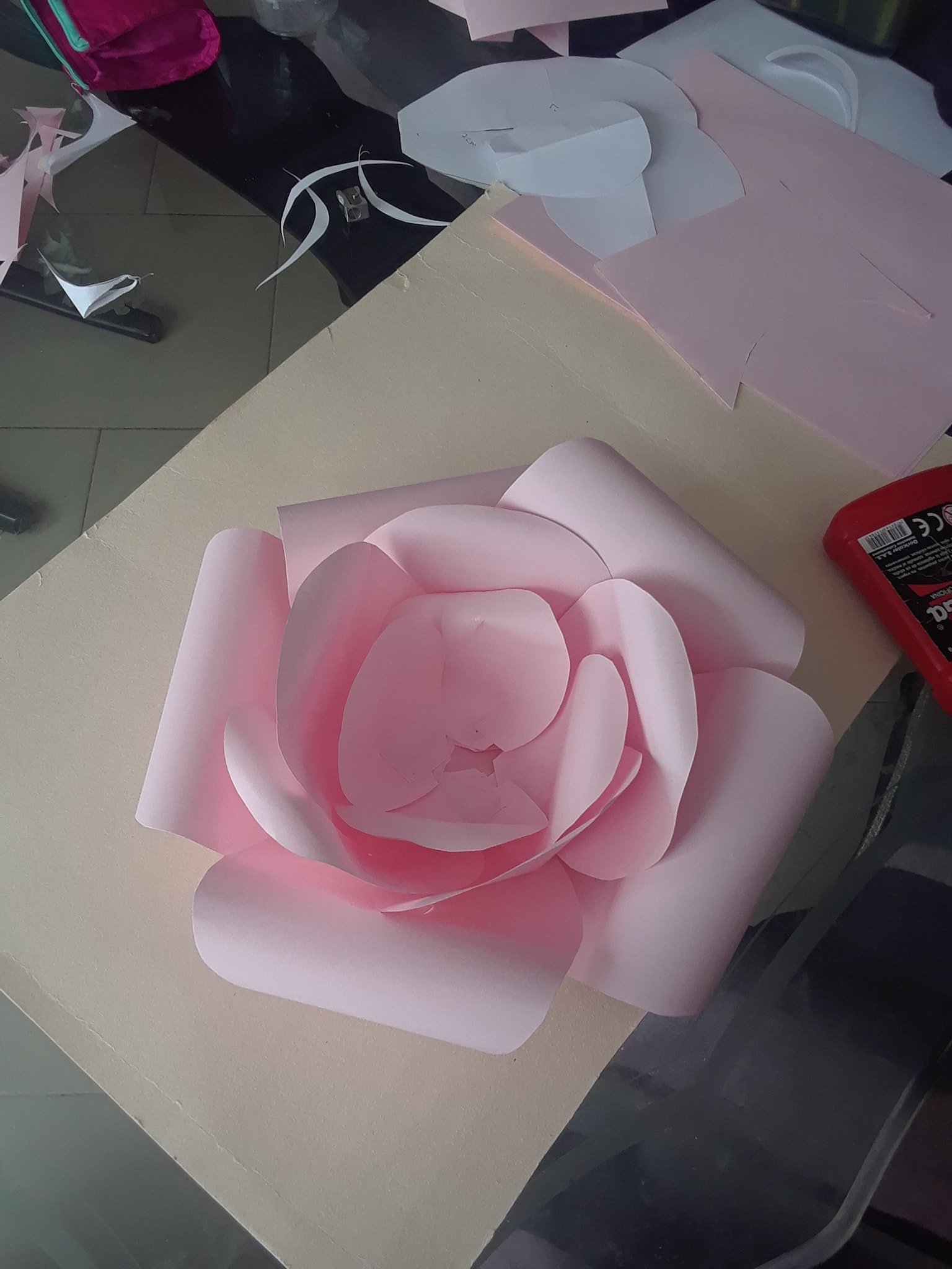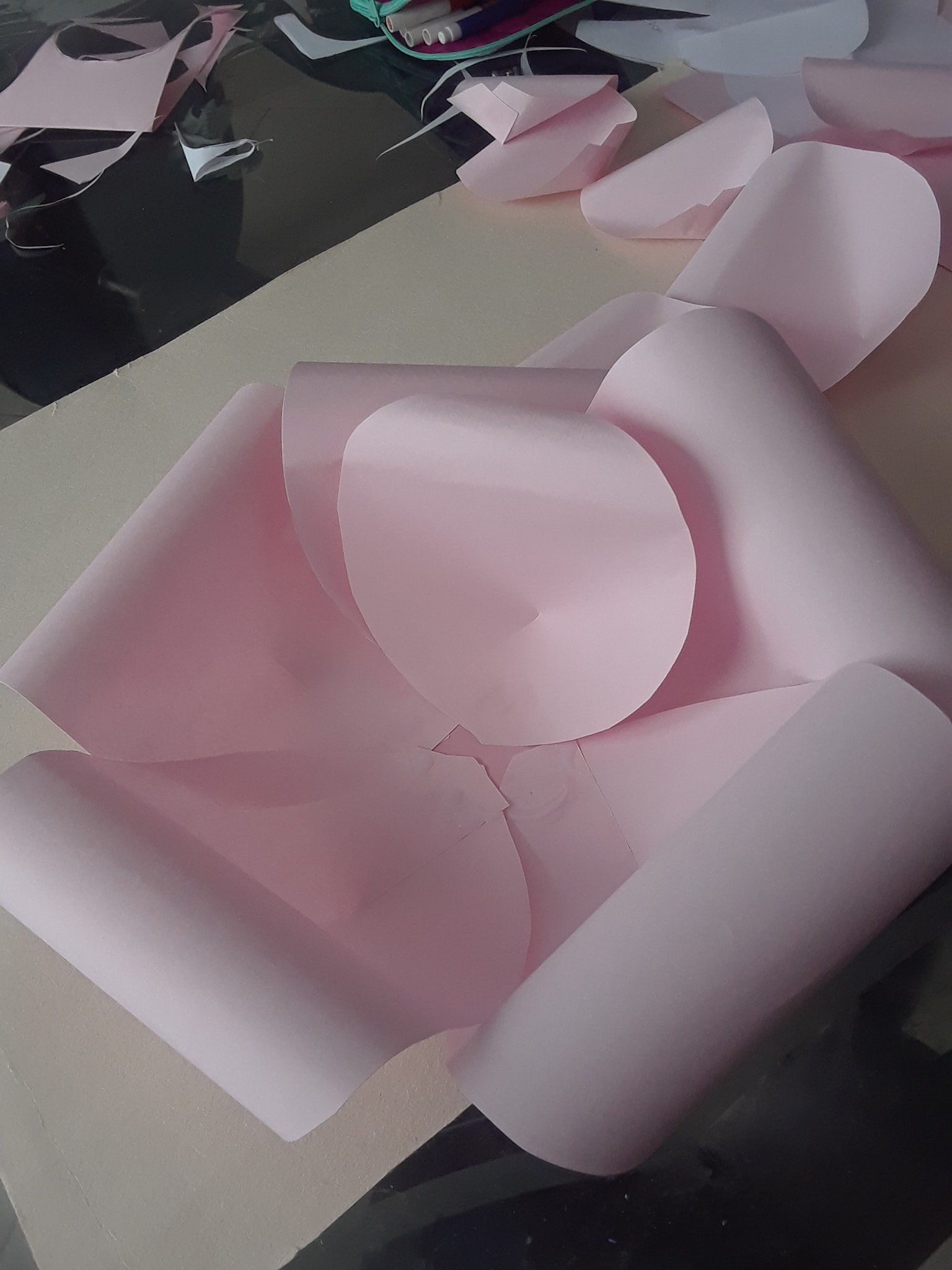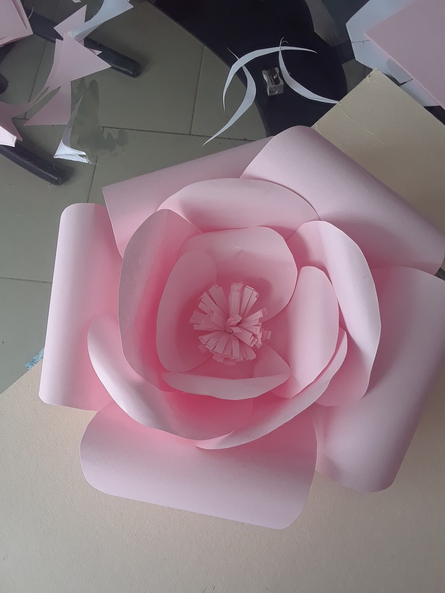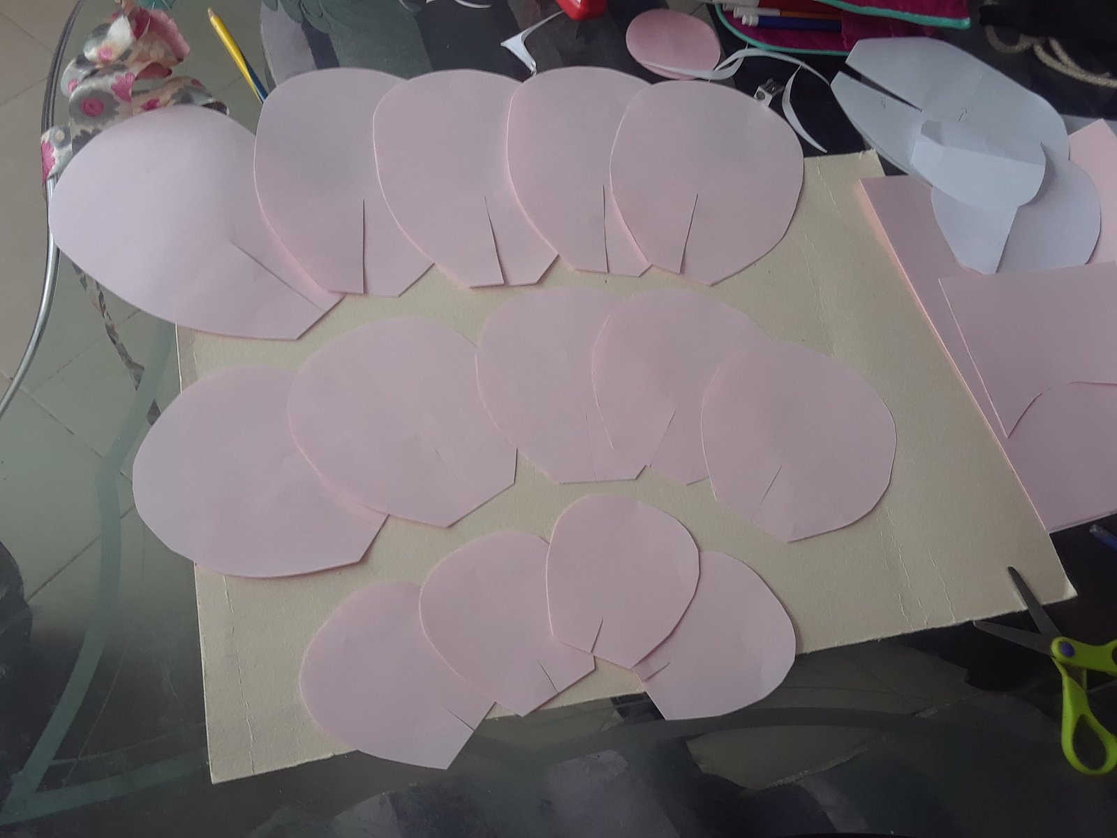 Esa es la forma más fácil de hacer estas flores gigantes, también hay otras formas más elaboradas como por ejemplo hacerlas pétalo por pétalo, para ello tendrás que cortar los pétalos uno por uno tratando de que sean lo más parecidos posibles, te puede ser de mucha utilidad hacer un pétalo como plantilla y cortar todos los demás usando este como molde.