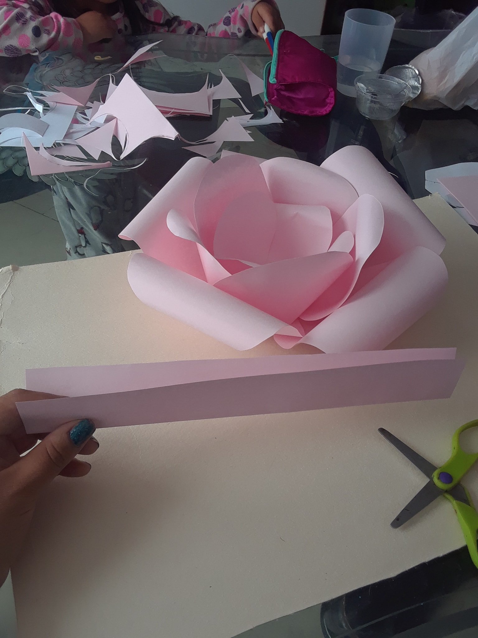 Este método sirve tanto para hacer flores chicas o medianas como para hacer flores gigantes, eso sí, para las flores gigantes puedes ayudarte con una abrochadora en la base ya que con la cola solamente puede que cueste fijar y pegar.