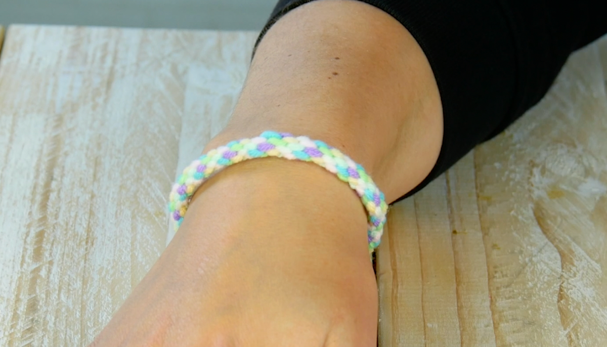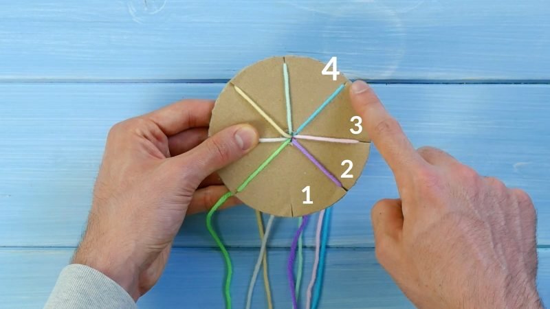 2. Luego tome los 7 cables; deben ser lo suficientemente largos para envolver alrededor de su muñeca. Haz un nudo en un extremo de la lana y pasa los extremos sueltos por el agujero.