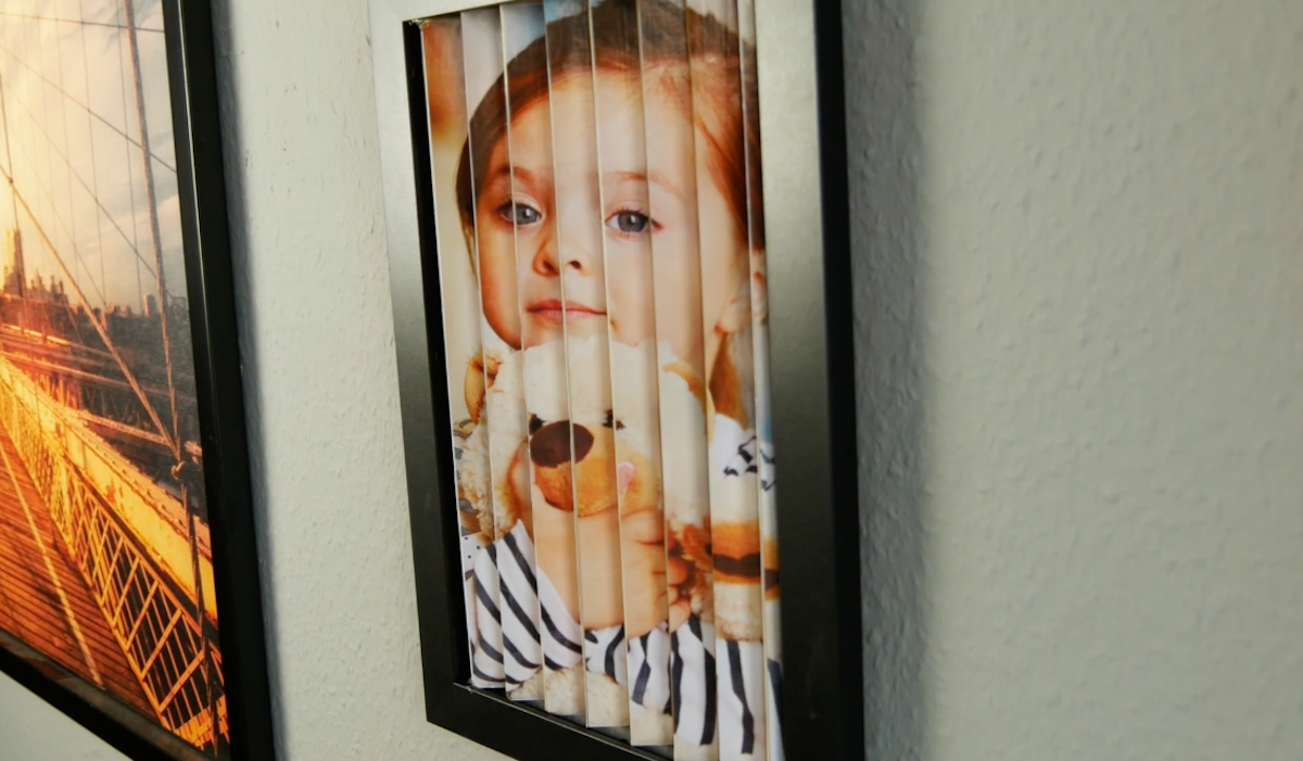 1. Corta las fotos en tiras a lo largo, cada una de 2 cm de grosor. Lo ideal es marcarlos primero en la parte de atrás con lápiz y regla. Luego córtalos con un cuchillo.