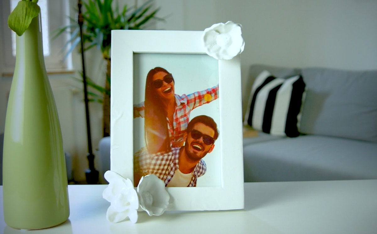 3. Retire el vidrio y la pared trasera del marco. Pegue 1 o 2 flores de yeso con pegamento caliente y pinte con aerosol toda la pieza. Tu decoración floral está lista.