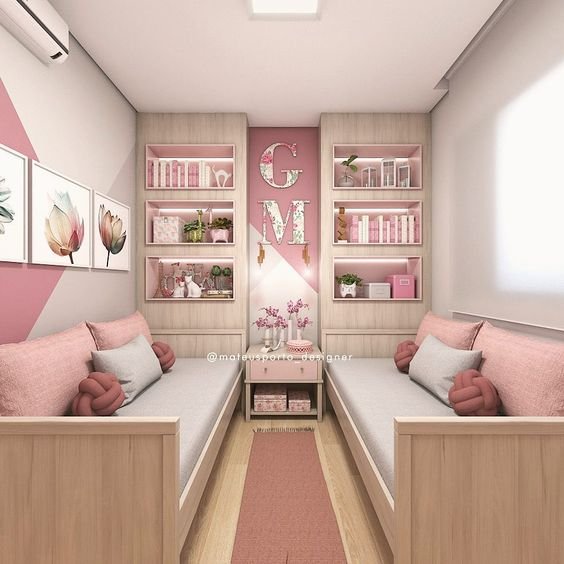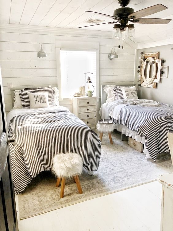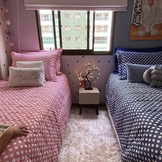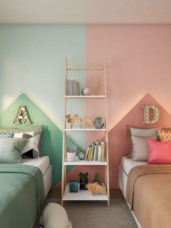 Este dormitorio para dos está dividido en dos colores, para cada uno su color favorito, además también identifica cada parte con una letra de la inicial del nombre en la cabecera de la cama. Una idea muy buena para darle identidad a cada parte.