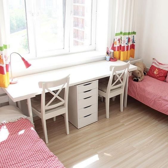 Puedes agregar una mesa donde puedan sentarse cómodamente a dibujar o hacer las tareas. Esta mesa escritorio está situada justamente junto a una ventana, lo que le da luz natural perfecta para dibujar , escribir, o estudiar.