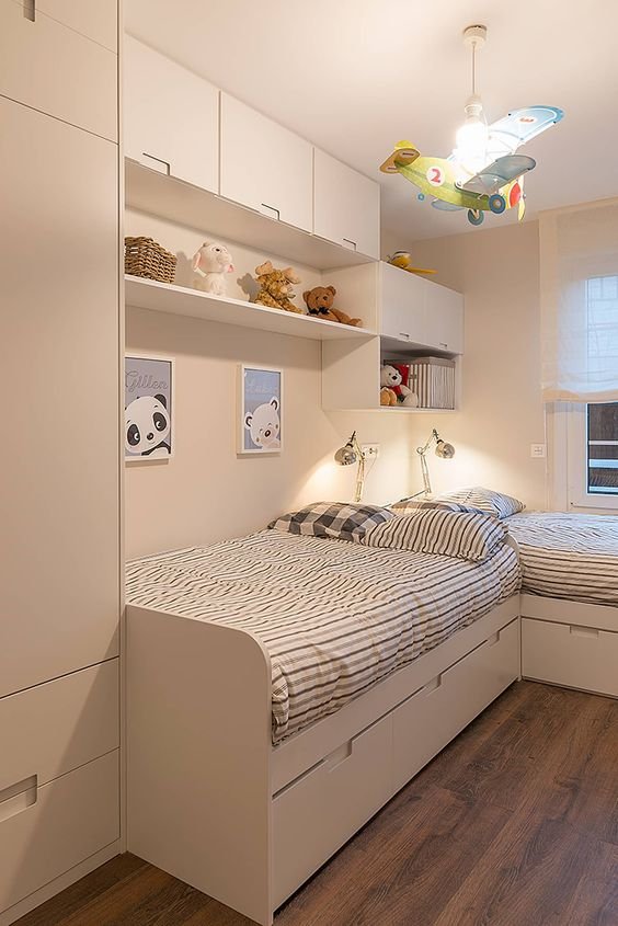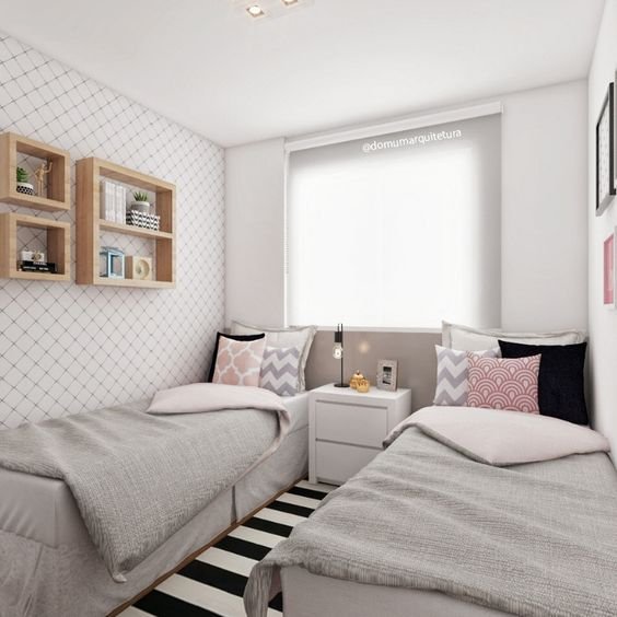 La siguiente foto nos muestra como un dormitorio pequeño puede ser perfectamente compartido entre dos niños. Un dormitorio minimalista ya que las camas no cuentan con cabeceras, en su lugar comparten una ventana que aporta luz natural al dormitorio, además el empapelado en sólo una de las paredes le termina de dar textura y un aspecto divertido a la habitación.